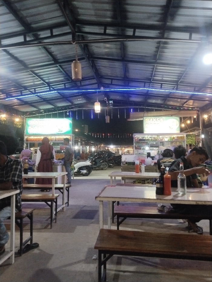 The image depicts a semi-outdoor food stall area at night in Gampongpaya, Indonesia