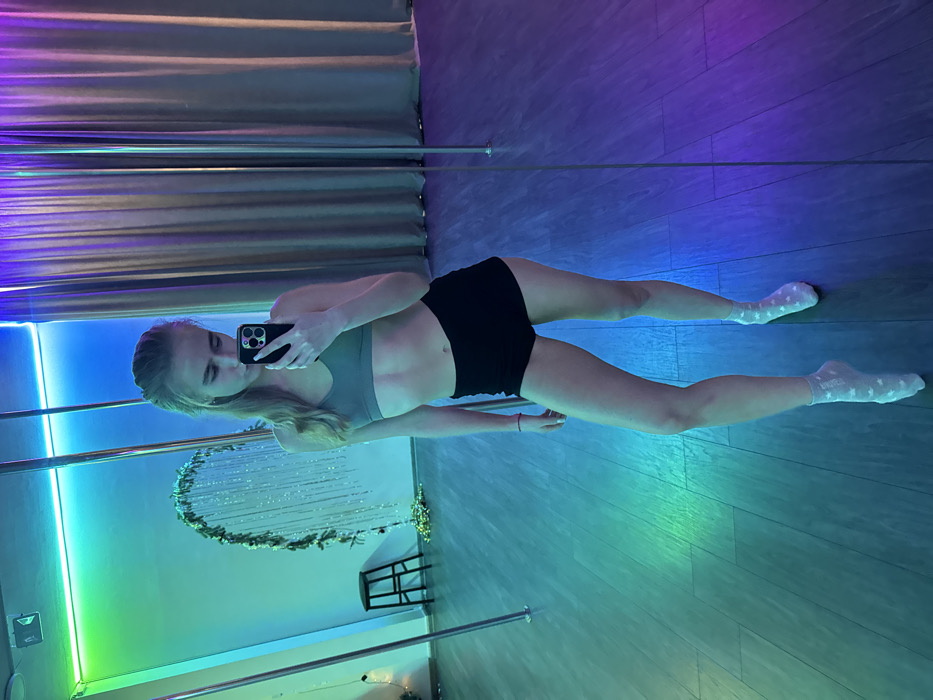 A woman in a sports bra and shorts is photographed from above in a mirrored room. She is holding a cell phone up and taking a selfie. Her legs are spread apart in a wide stance. The floor is shiny with blue and green lighting. There is a pole in the room and a white curtain.