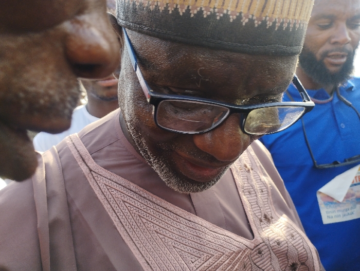man in a brown, embroidered robe and a brown hat with a black brim. He is wearing glasses and looking down. He appears to be talking to a person off-camera who is partially visible on the left side of the image. Another man, wearing a blue shirt with a white inscription, is standing behind the man in the robe and looking on. The scene appears to be outdoors, in a location with a light and sunny environment. The latitude and longitude coordinates provided in the prompt place this location in Chum, Nigeria.
