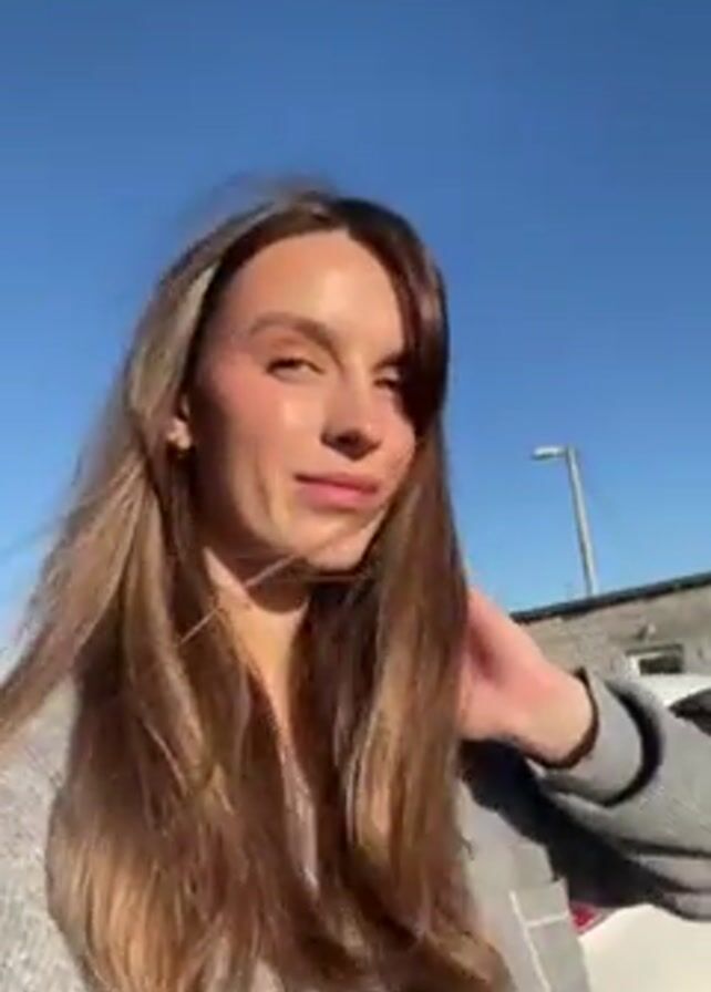 A woman with long brown hair stands outside on a sunny day. She's wearing a gray cardigan. In the background are parked cars, a building, and a light pole against a bright blue sky. She adjusts her hair with her hand and looks directly at the camera.