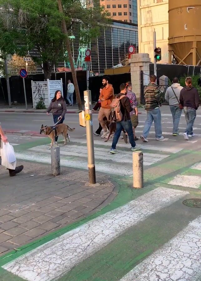 - "street scene with a group of pedestrians and two dogs crossing a crosswalk" by FM-KnXV32, licensed under CC BY 4.0