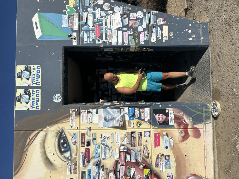 An outdoor image captured in the Shaar HaNegev Regional Council, Israel, depicts a bald adult male emerging from a dark, recessed doorway on a brightly lit, heavily stickered and graffitied wall under a clear blue sky