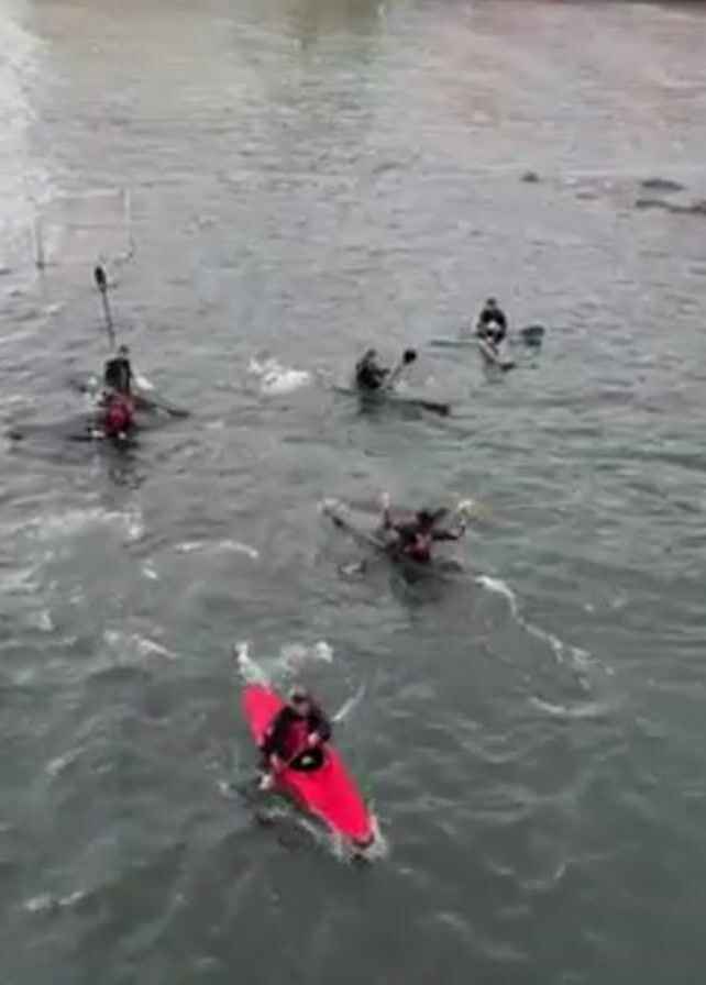 game of kayak polo being played in a harbor or river. Six people in kayaks, some black and one red, paddle around a floating ball near a net. They use paddles to hit the ball in an attempt to score. The background includes buildings and parked boats.