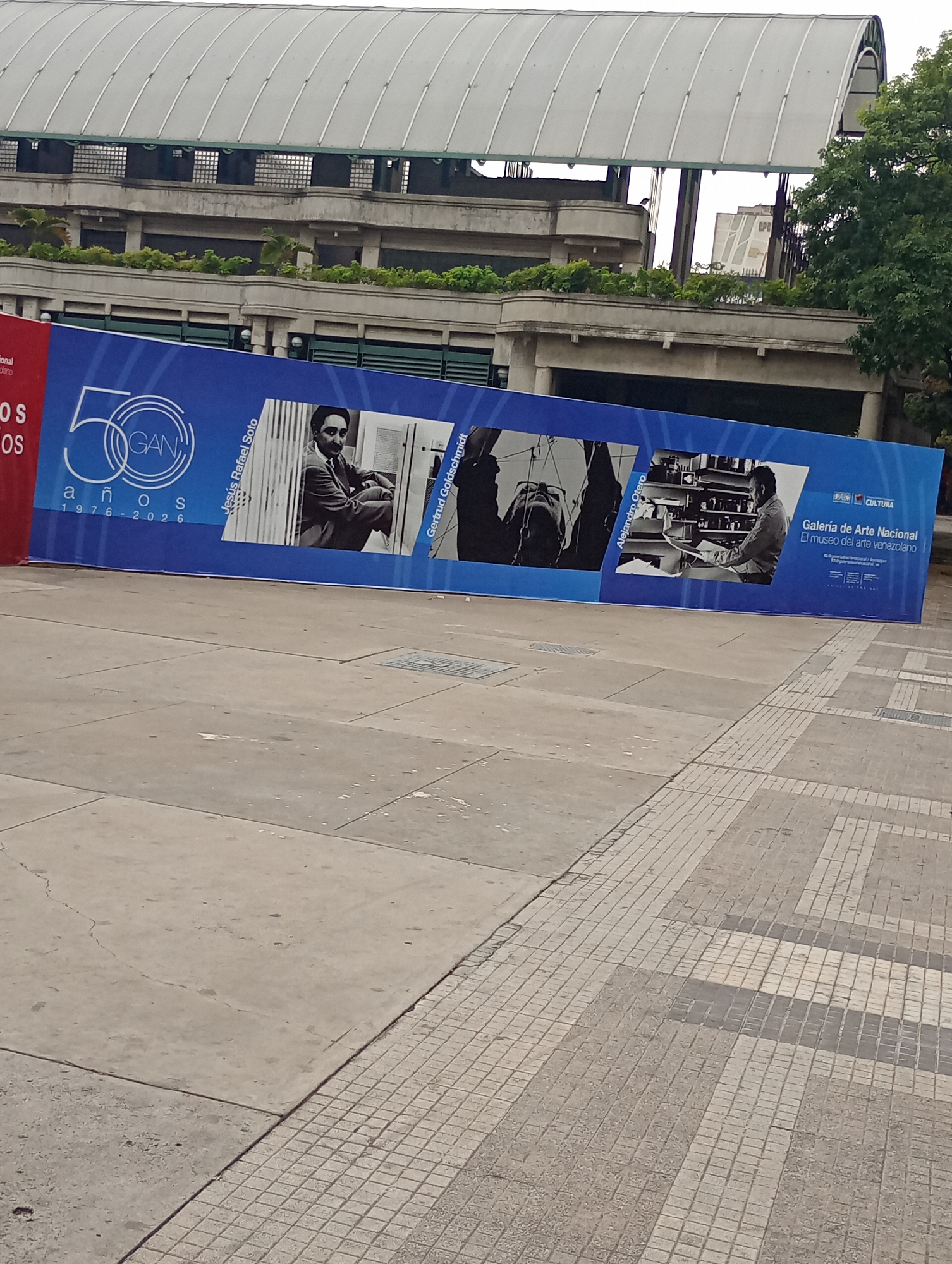 Here's a detailed description of the image: **Scene:** The image captures an outdoor scene in what appears to be a plaza or open area in Caracas, Venezuela. **Banner:** The most prominent element is a large blue banner commemorating the 50th anniversary (1976-2026) of the Galería de Arte Nacional (GAN), the National Art Gallery of Venezuela. The banner features black and white photographic portraits of three artists: Jesús Rafael Soto, Gertrud Goldschmidt, and Alejandro Otero. The banner also displays the logos of GAN and the Ministry of Culture. **Background:** The backdrop includes a multi-level building structure with a curved roof. There are also patches of greenery or plants visible on the building's terraces. Trees can be seen further in the background, suggesting an urban environment. **Foreground:** The foreground is dominated by a paved area. The pavement is made of large concrete slabs and smaller paving stones. **Overall Impression:** The image presents a snapshot of public art and cultural commemoration in Caracas. The presence of the National Art Gallery's banner and the portrayal of significant Venezuelan artists suggest a focus on the country's artistic heritage and contemporary art scene.