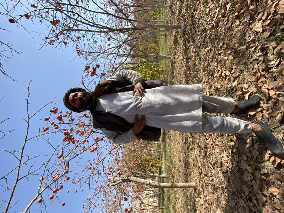 A male individual stands centered in an orchard in Bazar-e Panjva'i, Afghanistan, facing forward with a slight gaze upward and to the right