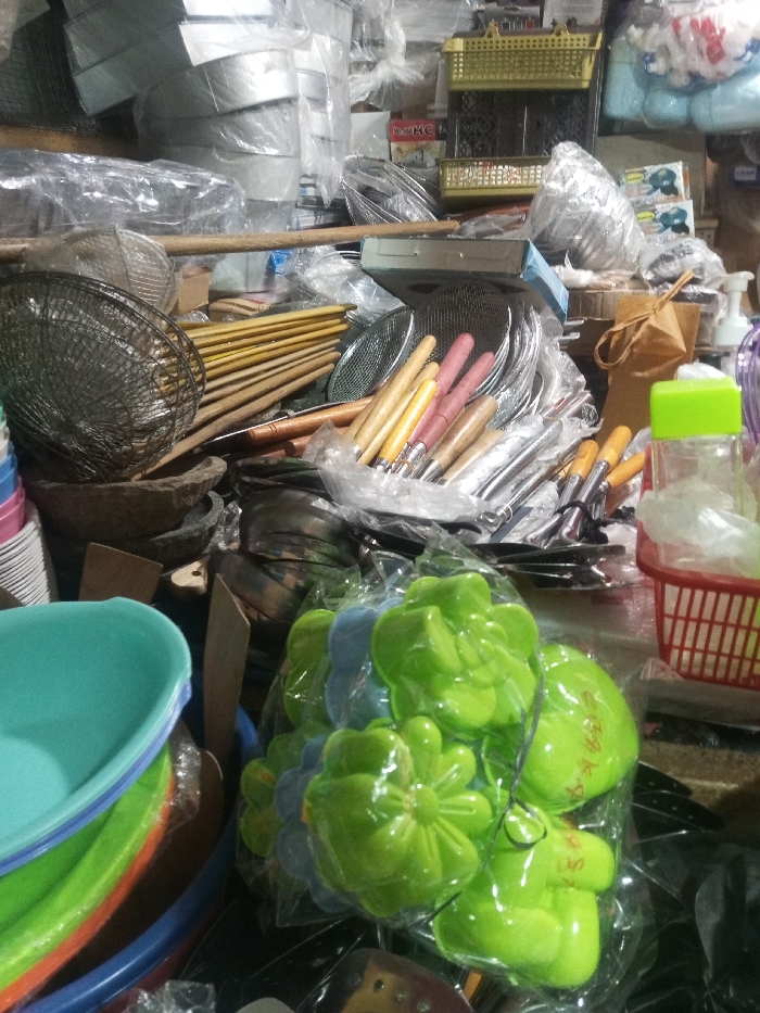 A cluttered scene displays an assortment of kitchenware. Stacks of colorful plastic bowls sit next to green, flower-shaped molds encased in plastic. Behind these are various metal cooking utensils with wooden handles, along with metal strainers and sieves. Stacks of wrapped aluminum baking pans are visible in the background, with other miscellaneous items filling the scene.