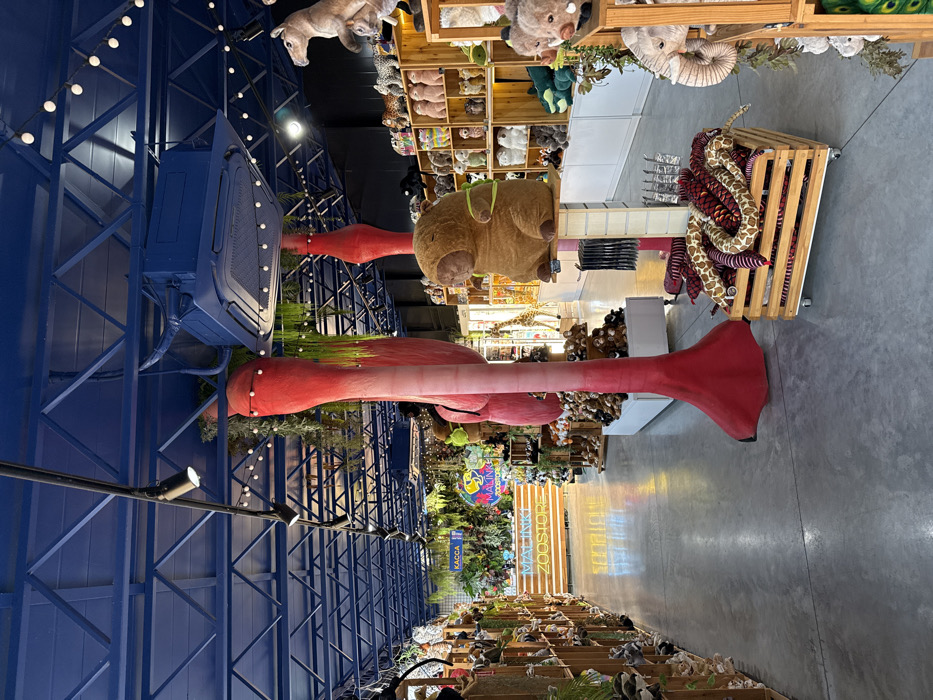 The image displays the interior of a retail store identified as "Malinki ZooStore," located at Komsomolskaya ulitsa, 22Б, Shakhty, Rostov Oblast, Russia. The environment features a high ceiling with exposed blue metal truss framework and overhead track lighting with spotlights. String lights with small white bulbs are suspended across the ceiling, along with an oblong blue HVAC unit. The floor is concrete. Two large, abstract, red flamingo-like columnar structures serve as prominent decorative elements, extending from the floor towards the ceiling in the midground. Artificial green foliage hangs from the ceiling and adorns various display units. On the left, multiple wooden shelving units are stocked with a variety of plush animals. In the background, a wooden cash register counter is visible, illuminated by neon-like signs that read "КАССА" (Cashier) and "МАЛИНКИ ZOOSTORE." In the midground to the right, a large brown plush animal, resembling a marmot or groundhog, is seated on a white pedestal display, encircled by a green band. Directly below it, a wooden crate on wheels contains numerous coiled plush snakes. Further to the right, additional wooden shelves exhibit a diverse assortment of plush animals, including kangaroos, elephants, wild boars, and leopards. A tall plush giraffe is partially visible in the right background. No people are present or engaged in any actions or interactions within the depicted scene.