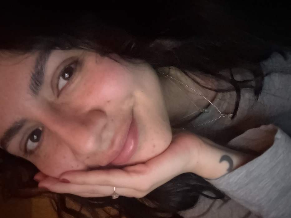 A woman with dark, wavy hair is pictured in a close-up shot. She rests her cheek on her hand, showcasing a small crescent moon tattoo on her wrist. She has brown eyes, freckles, and a subtle smile. A delicate necklace adorns her neck, and a ring is visible on her finger. She is wearing a grey long-sleeved shirt. The lighting is soft, contributing to a warm and intimate feel.