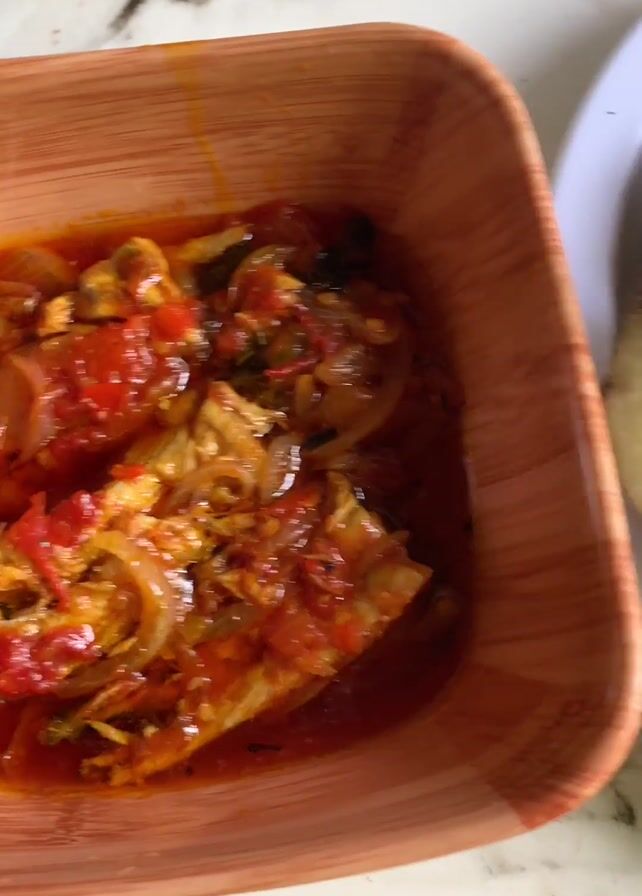 two dishes on a white marble surface. One dish is a square wooden bowl containing pieces of fish in a reddish sauce with visible onions and tomatoes. The other dish is a white round plate with cut pieces of yam, showing the brown skin and pale yellow flesh. The camera moves slightly between the two dishes.