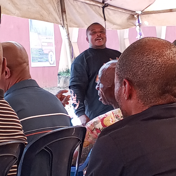 This image depicts an outdoor gathering in Orlu, Nigeria, beneath a white tent canopy. A dark-skinned male, appearing to be in his 30s to 40s, stands centrally, facing slightly right and upwards with his mouth open, as if speaking or singing. He wears a long-sleeved dark shirt, possibly black, with a lighter pattern visible on the lower part of his left sleeve. A small white object is visible between his lips. In the immediate foreground, three dark-skinned males are seated with their backs partially or fully towards the camera. On the far left, a person in a white and dark striped shirt is partially visible. Next, a bald man in a dark blue polo shirt with two white and one orange horizontal stripe is seen from the back, with his right hand raised in a gestural pose. To his right, an older, bald man with some grey stubble is seated in profile, looking towards the standing man with his mouth slightly open. He wears a colorful patterned shirt, possibly a traditional African fabric, featuring yellow, red, and black motifs. On the far right, the back of a bald man's head and a dark-colored shirt are visible. The background features a pink or mauve-colored wall with a white rectangular poster containing text and graphics affixed to it. Green foliage is visible behind the wall. Dark-colored plastic or metal chairs are partially visible in the foreground, occupied by the seated individuals. The overall lighting suggests daytime conditions.