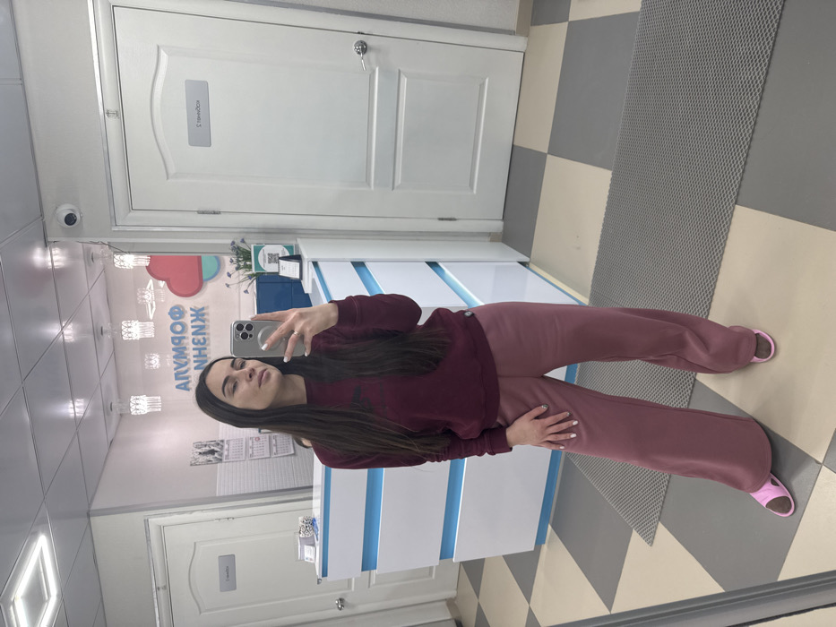 An interior scene depicts a young adult female taking a mirror selfie within what appears to be a cosmetology clinic reception area, identified as "Formula of Beauty" (Формула Красоты) located at Ulitsa Kulibina, 22, Perm, Russia. The female subject has long dark hair, wears a maroon long-sleeved top, dusty rose wide-leg pants, and pink open-toe slides. She holds a light-colored smartphone with a visible multi-lens camera array in her right hand, angled towards the mirror to capture her reflection. Her left hand rests at her side, displaying white nail polish. The background, seen in reflection, features a modern white reception desk with horizontal blue illuminated accents. Above the desk, a reflected sign clearly displays "ФОРМУЛА КРАСОТЫ" (Formula of Beauty) in Russian. To the right of the subject, a white paneled door exhibits a reflected grey sign reading "Косметолог" (Cosmetologist). Another white door is partially visible to the left. The white ceiling features multiple square light panels and several decorative clear chandeliers. A white surveillance camera is mounted in the upper right corner of the reflected image. The floor is covered with large checkered tiles in light and dark grey, with a dark grey textured mat positioned on the floor in front of the reception area. A wall calendar, a small floral arrangement in a blue vase, and a QR code stand are also visible on or near the reception desk.