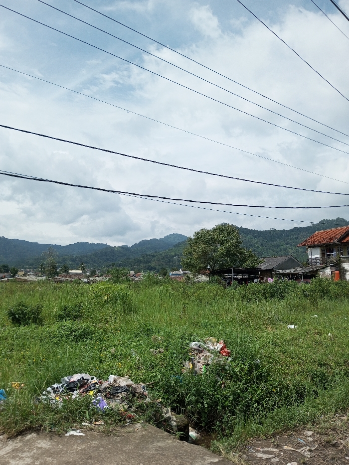 The scene depicts a rural or semi-urban landscape in Ariyalai, Sri Lanka, under a cloudy, overcast sky. The foreground features an unkempt field of tall green grass and weeds, with multiple clusters of assorted refuse, including plastic bags and various litter, scattered throughout. A narrow, dark ditch containing visible liquid is present in the lower right. Overhead, multiple black electrical or communication wires extend horizontally across the upper portion of the frame. In the midground, a cluster of residential structures is visible, including a two-story building on the right with white walls and a distinctive reddish-orange tiled roof. To its left, a large, dense green tree stands prominently, partially obscuring simpler, single-story structures with darker roofs. Further left, additional dwellings and what appears to be a tall metal tower are visible. The background is dominated by a range of verdant, tree-covered hills under the cloudy sky. No individuals, animals, or active interactions are observable.