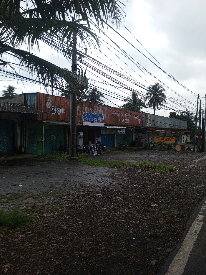 The image captures an urban street scene in Kamji Na-Yekha, Bhutan, under an overcast sky. The foreground consists of dark, damp earth mixed with gravel and sparse green vegetation, leading to a paved road section on the right with a white edge line. In the midground, a row of single-story commercial structures with corrugated metal roofs extends horizontally. From left to right, these buildings include a dark-colored door, a teal-colored roller shutter with green graffiti, and a building with a reddish-brown corrugated metal wall adorned with faded white circular patterns and a prominent blue-and-white banner. Further right, another building features a light blue roller shutter, and the rightmost structure displays a yellow banner with text, including "LONTOM SAYUR" and "KOPI." A central utility pole equipped with a transformer is visible, supporting numerous overhead electrical and communication wires that traverse the scene. A dark scooter is parked near the teal-colored building. Multiple palm trees rise behind the buildings and in the background. No people are present.