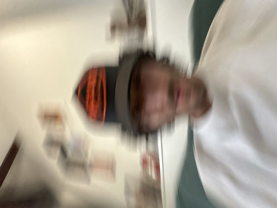 An image captured in Carnin, France, depicts a single male individual in a heavily motion-blurred, indoor setting. The subject, positioned centrally, wears a dark-brimmed cap with an orange or red crown featuring a dark, possibly geometric pattern. He has visible dark, curly hair and a discernible mustache. His attire includes a white, long-sleeved garment. The subject's face is indistinct due to blur, with his mouth appearing slightly open. He is seated, with a blurred green or teal surface, consistent with a couch or chair back, visible behind his shoulders. The background features a light-colored wall, upon which several highly blurred, rectangular or square objects, possibly contained within clear displays or frames, are visible on the left side. Indistinct blurred objects are also present on the right side of the wall. A dark linear object, possibly a ceiling beam or fixture, is visible in the upper left corner of the frame. The overall scene suggests an indoor environment.
