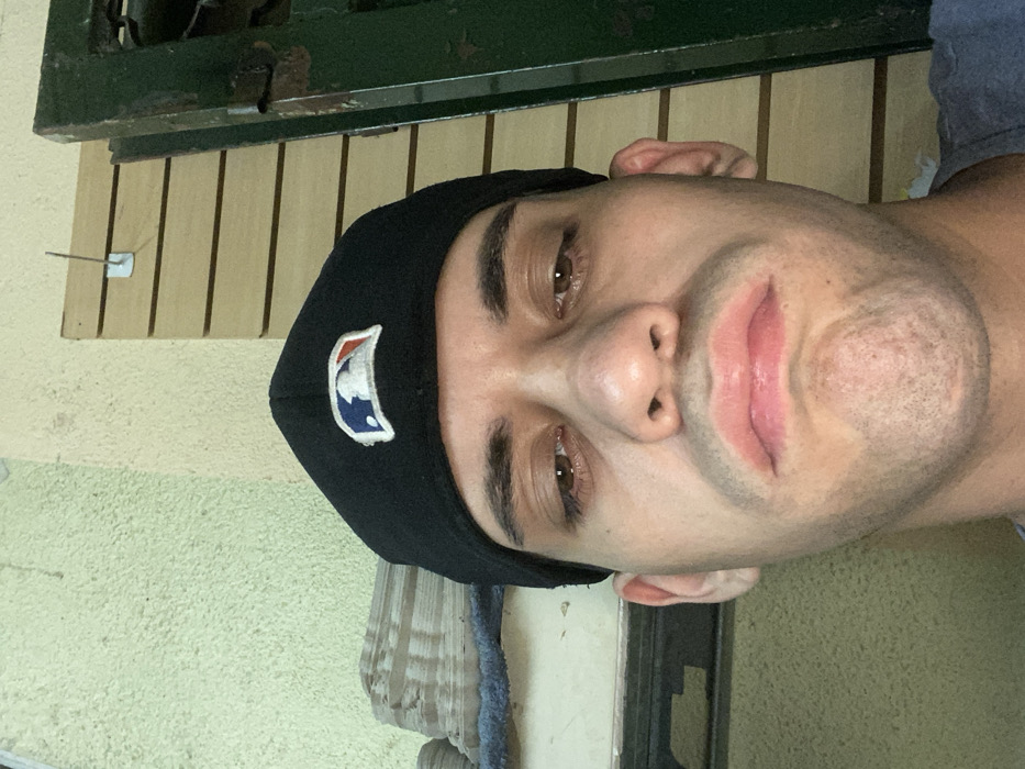 A man is wearing a black baseball cap with a white logo with blue and red accents. The cap sits atop his head, partially obscuring his forehead. He has brown eyes and a light complexion. The background includes a wall with vertical wooden slats. The man's expression is neutral.