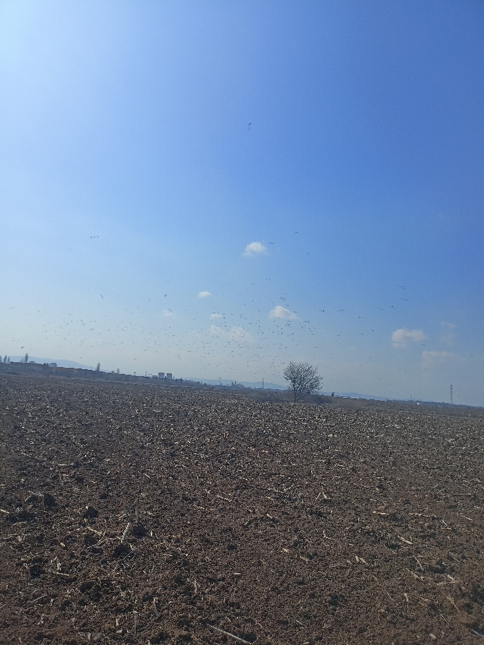 The scene displays an expansive, open agricultural field under a bright, clear blue sky, indicative of an outlying area of Sofia, Bulgaria. The foreground and midground consist of dark brown, freshly tilled earth, showing distinct clods of soil and scattered remnants of dry vegetation or crop stubble. This ground covers approximately the lower two-thirds of the image. In the mid-distance, a solitary, deciduous tree, bare of leaves, stands within the tilled field towards the right side of the frame. Beyond the field, a low horizon reveals the distant urban edge of Sofia, characterized by a faint skyline of buildings, including several multi-story structures that appear to be residential or industrial blocks. A tall, slender tower, possibly for telecommunications or power, is visible further right along the distant horizon. The upper third of the image is dominated by a clear, vibrant blue sky, featuring a few sparse, small white cumulus clouds. A very large flock of numerous small, dark-colored birds is visible in active flight, densely distributed across the lower two-thirds of the sky, above the distant cityscape and the field. No individuals, human or otherwise, are present or engaged in direct interaction within the observable scene. The environment transitions from cultivated farmland to a distant urban fringe.
