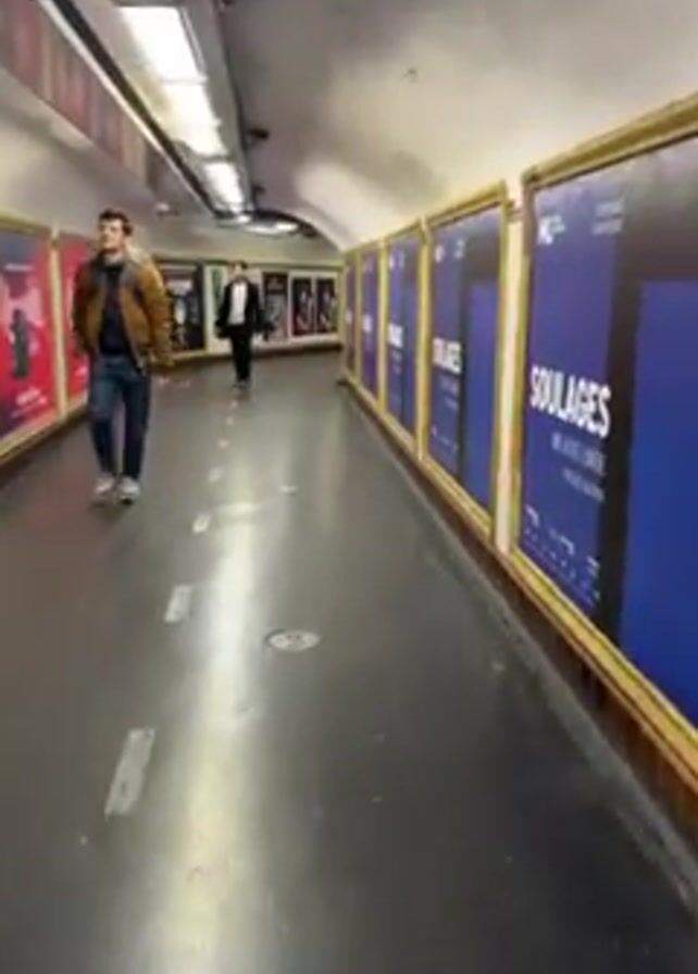 long hallway inside a metro or subway station. The hallway has a black floor with white markings, and the walls are lined with posters framed in gold. The posters have the word "SOULAGES" prominently displayed. Overhead lights illuminate the hallway. Two men are walking in the same direction down the hallway. The man in the foreground wears a brown jacket and blue jeans. The man in the distance wears a black suit.