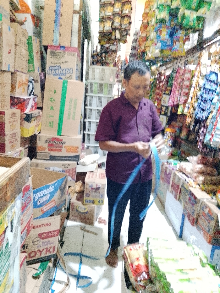 A man wearing a short-sleeved maroon shirt and black pants stands in a cluttered convenience store. He is barefoot and fiddling with a long, blue ribbon or string. The store is packed with boxes of snacks, crackers, and other goods stacked high along the walls. Hanging packages of candies and chips adorn the ceiling. The overall impression is of a small, crammed, but well-stocked local shop.