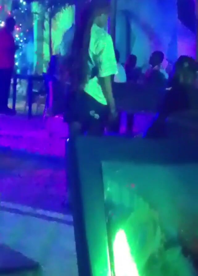 dimly lit room with blue and green lighting. There are people in the background, including one wearing a red shirt standing near a small Christmas tree. In the foreground, a person wearing a light-colored shirt and dark pants is walking. The camera focuses on the person, though they are somewhat out of focus. The scene appears to be in a club or lounge-type environment with people seated in the background. A screen, likely a monitor or television, is visible in the lower right corner, displaying an unclear image. The overall atmosphere is lively, though difficult to discern clearly due to the lighting and focus.