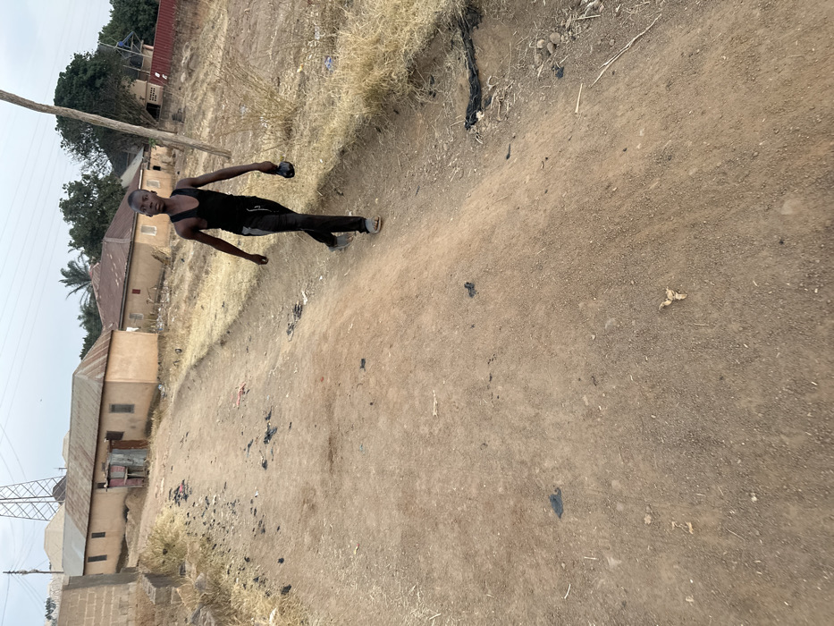 An individual in a black tank top and dark pants walks on a dirt path. Buildings and dry vegetation line the path's edge. A utility pole is visible in the background. The path is uneven and littered with dark debris. The person is holding an item in their left hand. The sky is overcast.