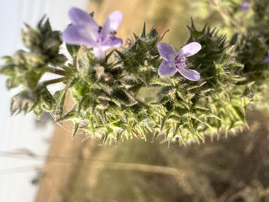 A close-up, vertical photograph depicts a section of a flowering plant in an outdoor environment. The central subject is a green stem, densely covered with numerous sharp, pointed, green bracts and fine white trichomes, giving it a spiky, hairy appearance. Two distinct, small, light purple, bilabiate flowers are prominently displayed, one in the lower center and another higher up and slightly out of focus. Each flower has four petals, with the lower lip displaying darker purple speckles or markings. Scattered among the spiky growths are several small, spherical, brownish structures, possibly undeveloped buds or seed capsules. The background is significantly blurred, rendered in shades of light brown and yellow, suggesting dry earth or vegetation. Faint, indistinct vertical lines are present in the far background. No identifiable landmarks, structures, or individuals are present to pinpoint a specific location within the city of Keffi, Nigeria, beyond the general outdoor setting.