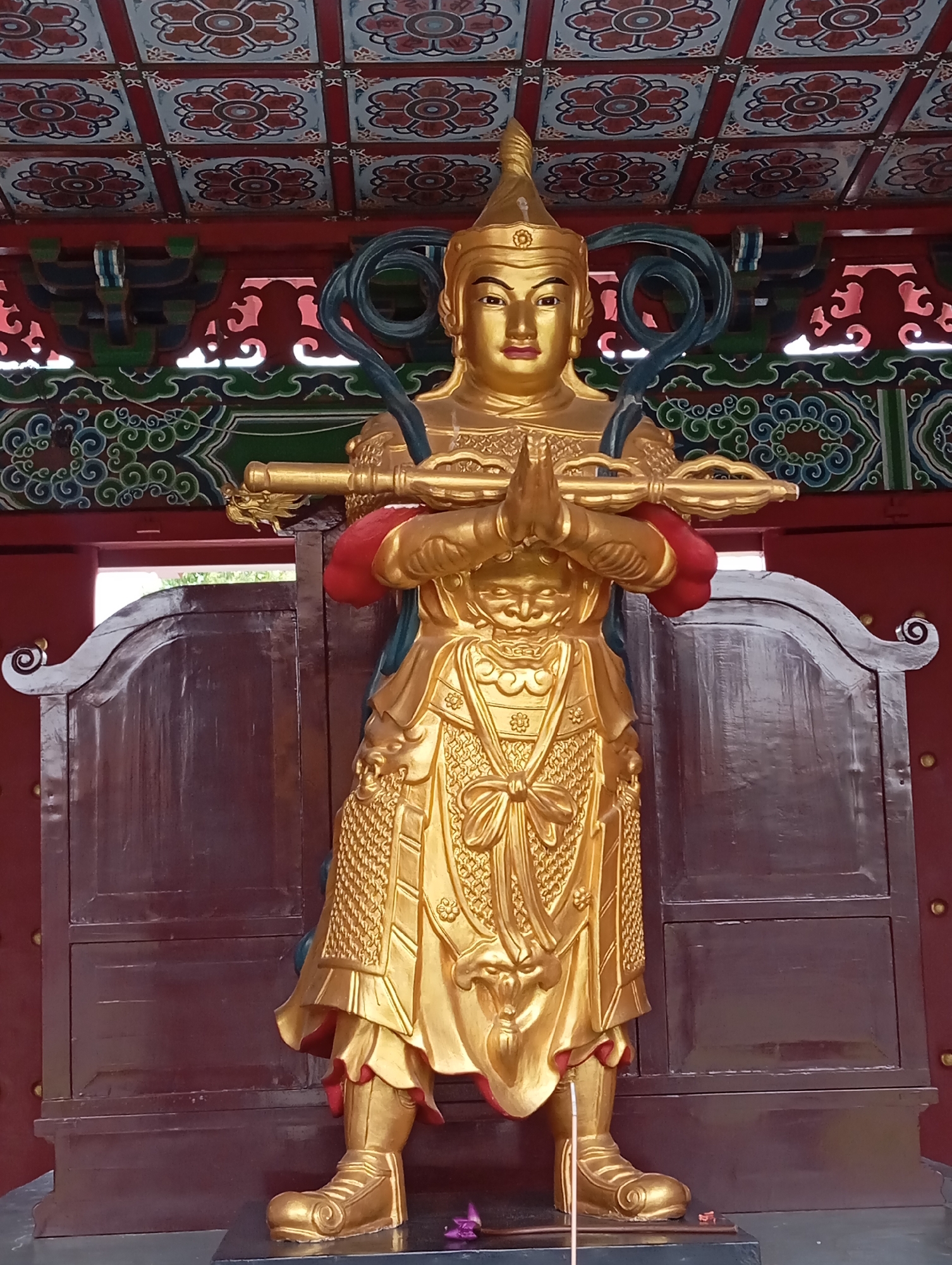 A full-body, golden statue of a deity or guardian stands prominently within a temple structure in the city of Oshojetban, Nepal