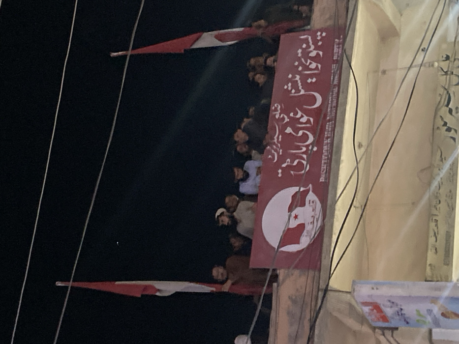 A nighttime scene depicts a group of approximately 10-15 adult males gathered on an elevated platform or balcony overlooking a street in Qilla Saifullah, Pakistan