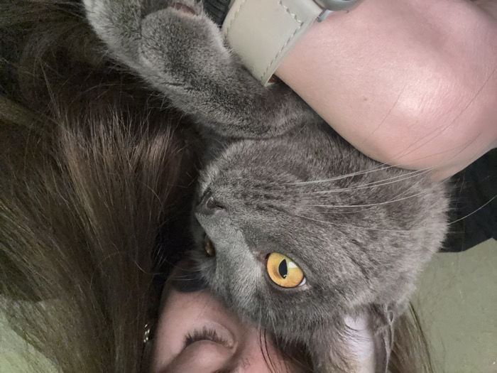 The image depicts an indoor scene in Прикамский, Russia. A person with long, dark brown hair is seen with their right eye closed, their face partially obscured by a gray domestic cat. The cat, characterized by short gray fur and prominent amber-colored eyes, has its head resting against the person's right cheek and neck area. The person's left hand, visible to the lower-left of the cat and wearing a light-colored watch or bracelet, is holding the cat close. The cat's gaze is directed towards the upper-right portion of the frame. The background is softly blurred, displaying indistinct light green or beige tones, consistent with an interior setting.