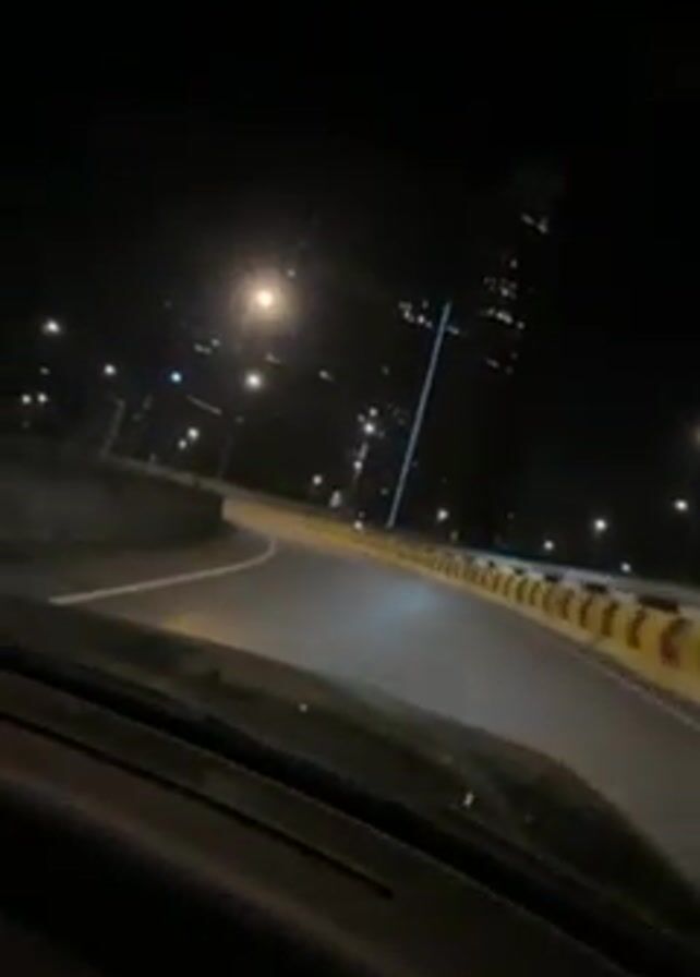 A view from inside a vehicle traveling on an empty road at night. The road is curving and bordered by yellow and black barriers. Streetlights illuminate the road. Tall buildings are visible in the background. The vehicle appears to be accelerating or maintaining a consistent speed as it navigates the curve. The windshield shows some minor reflections.