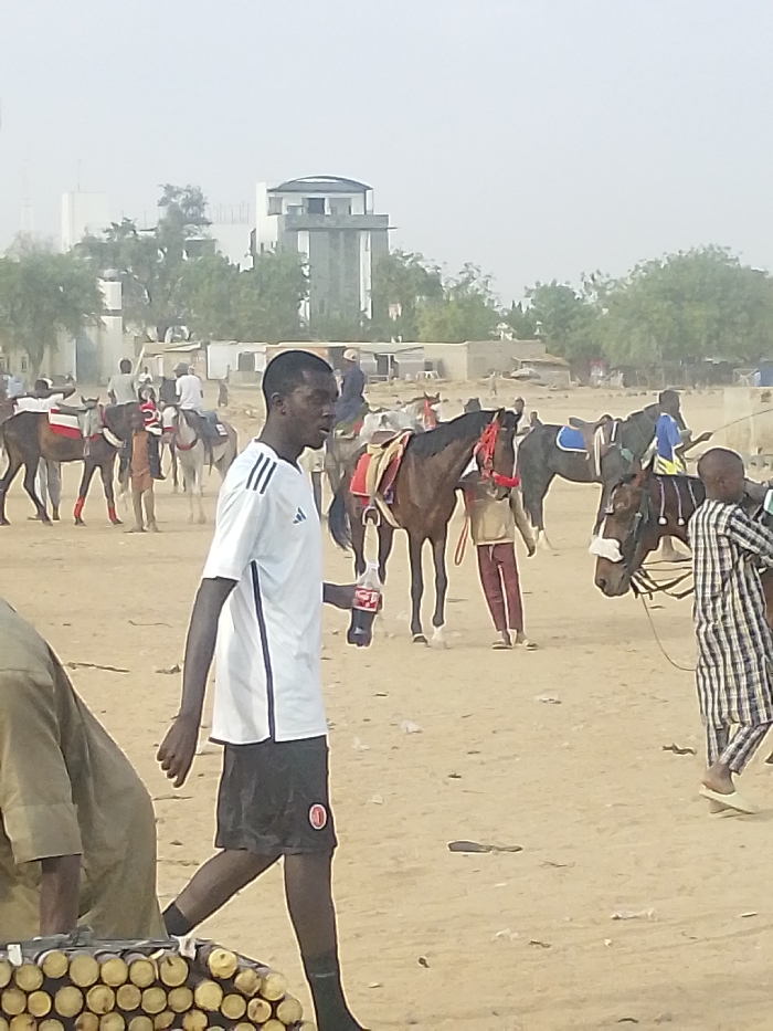 A sandy outdoor scene unfolds with horses and people. Several horses are saddled and ridden, while others stand with handlers. A man in a white shirt and black shorts walks in the foreground holding a bottle, appearing to observe the scene. Another person is partially visible on the right. Sugarcane is present at the lower left. A building structure with a watch tower can be seen in the distance. The atmosphere looks dusty and the scene suggests a gathering or event.