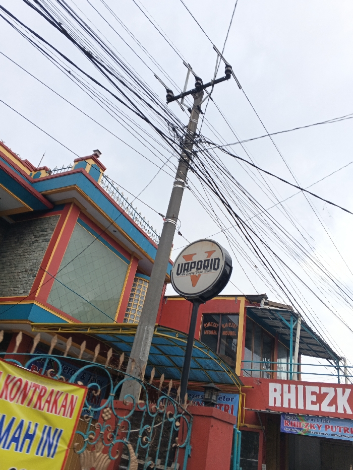 cluttered urban scene with a prominent utility pole tangled with numerous wires against a cloudy sky. A brightly colored building stands nearby, adorned with teal and red trim. Signage is visible for "Vaporio" and "Rhiezk," seemingly advertising local businesses. A yellow banner in the foreground announces "Kontrakan Rumah Ini," possibly indicating a property for rent. The scene conveys a sense of densely packed urban life and informal commercial activity.