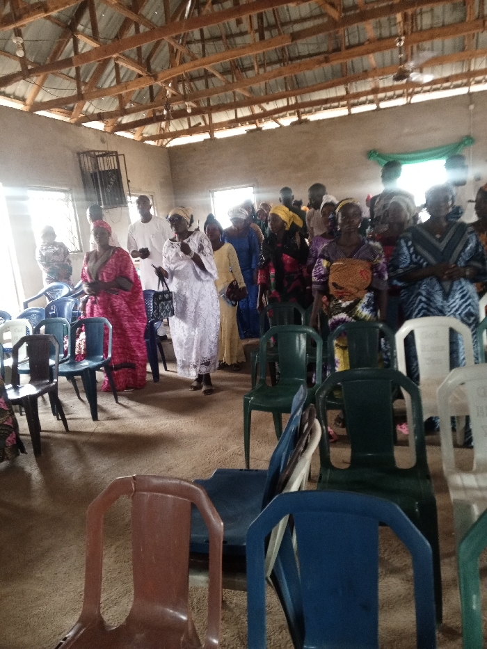 The image depicts an indoor gathering of approximately 20-30 adults within a modest hall or community building in the city of Unknown, Unknown. The room features light-colored, unfinished concrete walls, multiple rectangular windows on the left admitting natural light, and an exposed wooden truss roof structure supporting corrugated metal sheeting. A dark-colored ceiling fan is visible hanging from the trusses. The floor appears to be unpaved, possibly dirt or packed earth. Numerous plastic chairs of various colors—blue, green, white, and brown—are arranged in rows, some occupied, others empty or partially stacked. The individuals, predominantly Black, are standing and facing generally towards the left side of the frame. Many women wear head coverings and vibrant traditional attire, including patterned dresses and wraps in shades of pink, yellow, blue, and purple. One woman in the foreground wears a white lace dress and head covering, holding a dark handbag. A man in a white tunic stands near her. Several individuals appear to be engaged in a collective activity, with some mouths open, suggesting singing or speaking. A draped piece of green fabric is visible on the far wall towards the upper right as a decorative element.