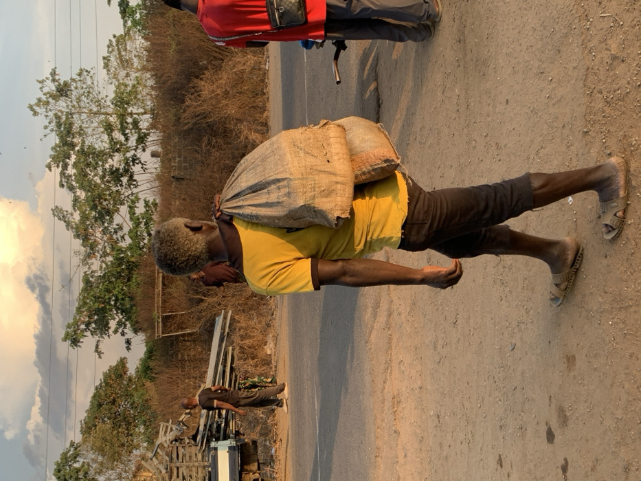 - "An elderly man in a yellow t-shirt and dark shorts walks along a dirt road, carrying a large sack on his back" by FM-JIEGo1, licensed under CC BY 4.0