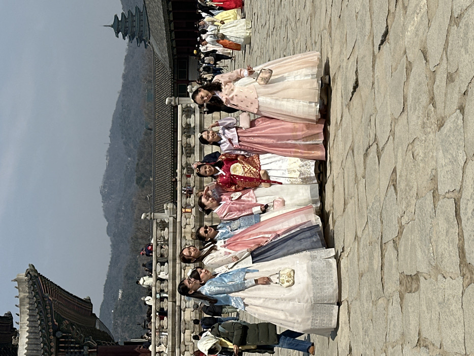 - "A group of eight individuals, primarily female, are positioned in the foreground of a large, irregular stone-paved courtyard at Gyeongbokgung Palace in Seoul, South Korea" by FM-e0TMf1, licensed under CC BY 4.0