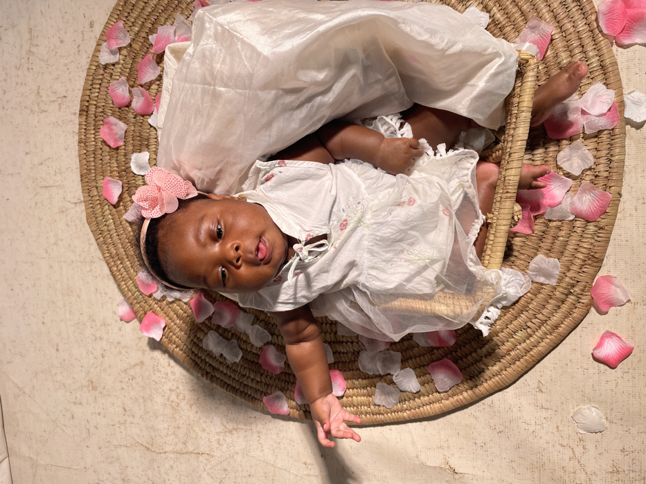 An infant, identified as female, of African descent, is depicted lying on her back within a circular, woven straw mat