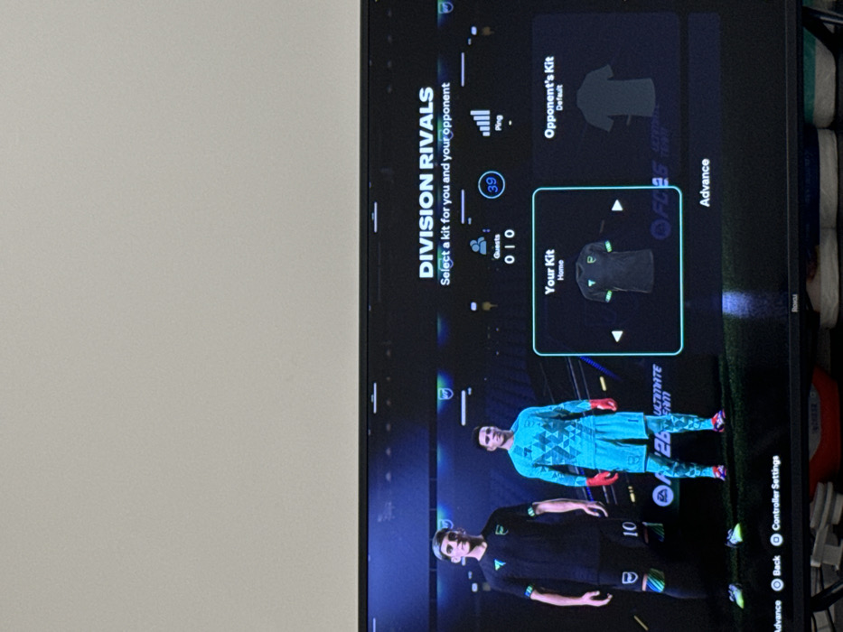 A flat-screen television displays a video game interface titled "DIVISION RIVALS," indicating a kit selection screen for a FIFA 23 Ultimate Team match. Two virtual male soccer players are depicted on a dark virtual field. The player on the left wears a black short-sleeved jersey with green accents and the number 10; the player on the right, a goalkeeper, wears a turquoise long-sleeved kit with a geometric pattern, complemented by red gloves and red socks. On the right side of the screen, selectable kits are presented, with "Your Kit" displaying a black jersey with green trim, and "Opponent's Kit" showing a gray silhouette. Game metrics like "Guests 0 1 0" and "Ping 39" are visible. Navigation prompts for "Advance," "Back," and "Controller Settings" are at the bottom. The television rests on an unidentifiable dark surface, with a partial red object and other indistinct items visible beneath it. A plain, light-colored wall forms the background above the television. This scene is observed within an indoor setting in the city of New York, United States.