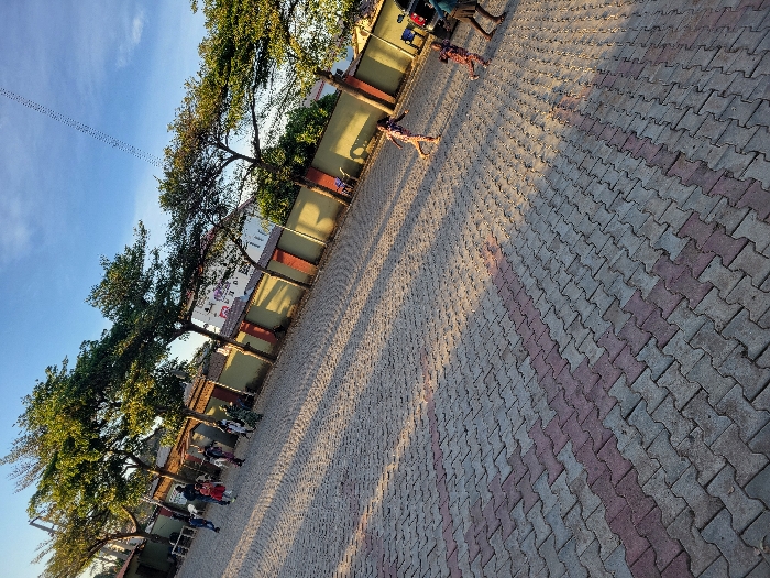 An angled perspective shows a paved area with alternating gray and reddish-brown bricks