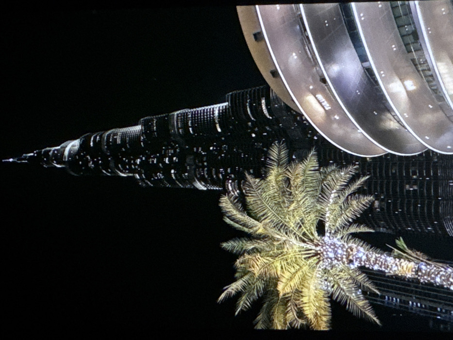 A nighttime image shows the Burj Khalifa in Dubai alongside a palm tree