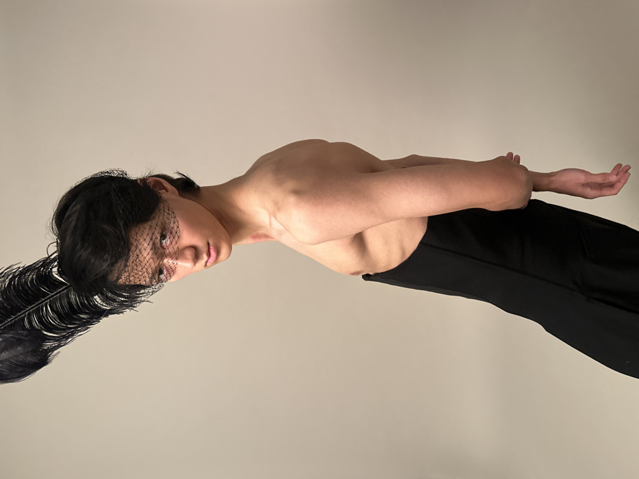 A slender, light-skinned person with dark hair poses sideways. The individual's chest and shoulders are bare, contrasting with black, high-waisted pants. Both arms are extended behind the back. A black net veil partially covers the face, adorned with a large black feather extending from the left side of the head. The background is a simple, light cream color. The subject gazes directly at the viewer.