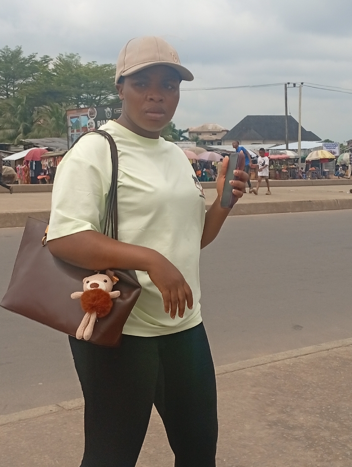 An adult female stands on a light grey paved surface in Ura Nta Umuarandu, Nigeria, with a road and a bustling market scene behind her
