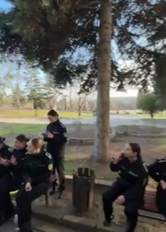 A group of people wearing black uniforms are gathered outside on a sunny day. Some are sitting on a bench looking at their phones. One person is standing and smoking a cigarette. Other people in uniform are standing nearby. A bald man in uniform looks directly at the camera. The setting appears to be a park or campus, with trees, grass, and a paved walkway. A building is visible in the background.
