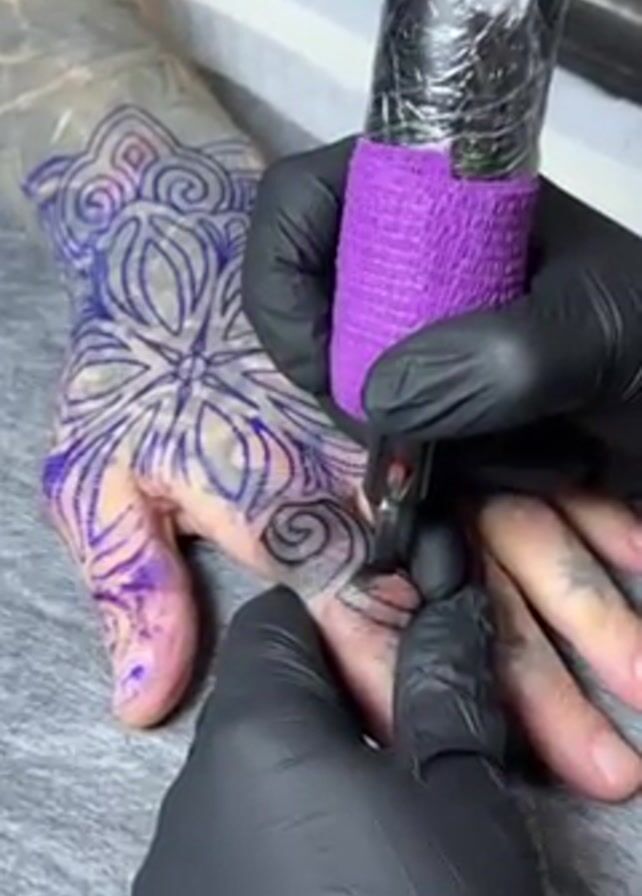 close-up of a person getting a tattoo on their hand. The person receiving the tattoo has a stencil of the design already on their hand, and an existing tattoo on their forearm. A gloved tattoo artist is using a tattoo machine wrapped in clear plastic and purple tape to ink the design onto the skin. The tattoo artist is focused on the area between the fingers. A gray surface is visible beneath the tattooed hand.