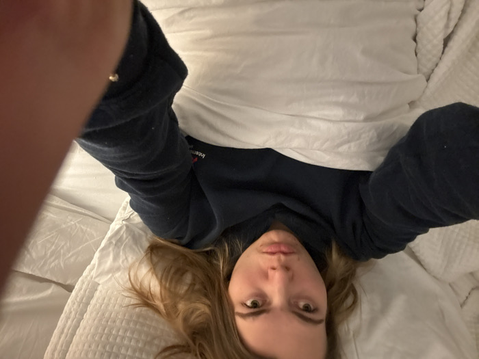 A person with light brown hair lies on a bed with white sheets and pillows. They are wearing a dark blue sweatshirt. The camera angle is from above, giving a view of their face and upper body. The left arm is extended towards the camera. The lighting is soft and even.