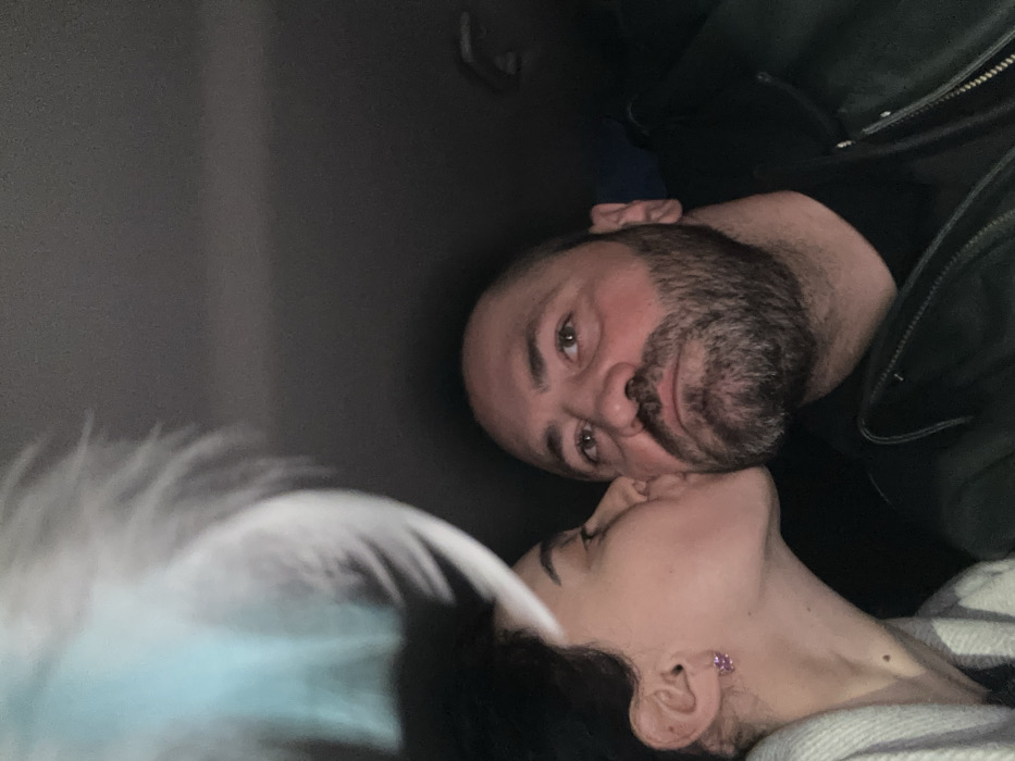 The image depicts two individuals inside a vehicle in Tbilisi, Georgia, during dim lighting conditions. On the left, a female with dark hair is shown in profile, wearing a light-colored garment and a small, reddish-purple earring on her visible left ear. She is leaning in to kiss the right cheek of the male positioned on the right side of the frame. The male has a trimmed dark beard and short dark hair or is balding; he wears a dark t-shirt and a dark leather-style jacket. His eyes are open and directed slightly upwards, with a neutral facial expression. In the upper left foreground, a large, out-of-focus object with white, feathery or furry texture and light blue accents is partially visible, obscuring a portion of the scene. The vehicle's interior appears dark with an indistinct background.