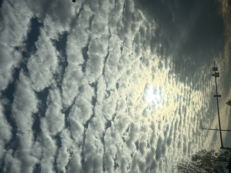 n expanse of altocumulus clouds, rippling across the sky in a pattern of repeating, elongated puffs. The sun is obscured by the clouds, its light diffused into a bright, hazy glow. The clouds transition to a denser, darker mass on the right. On the side, there's a traffic light and tree branches. The sky color transitions from dark blue to grey.