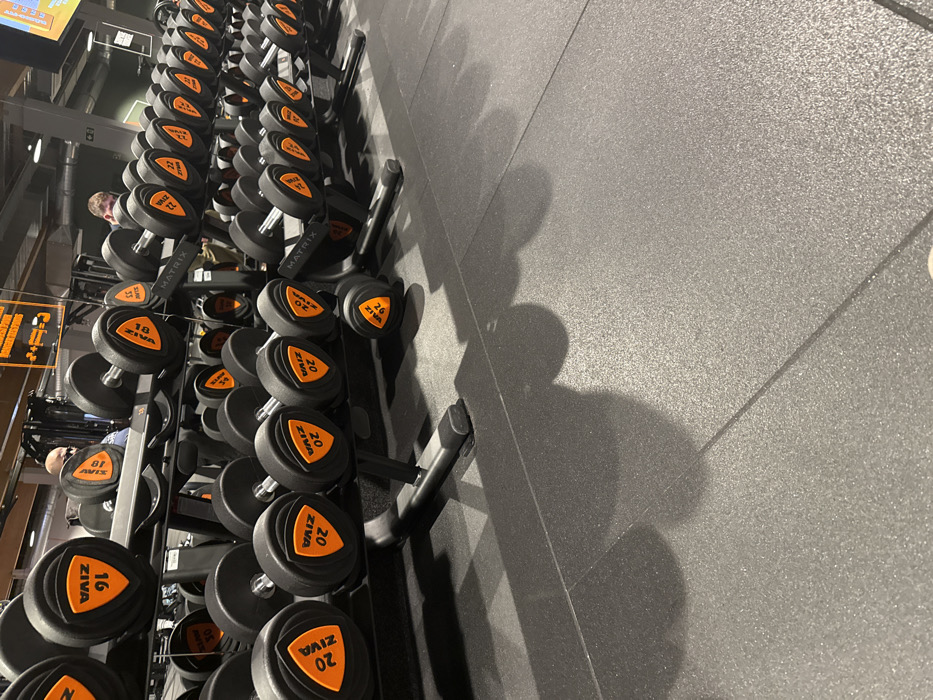 - "Rows of black dumbbells with orange labeling, resting on metal racks, dominate the left side of the image" by FM-sHh6Q2, licensed under CC BY 4.0