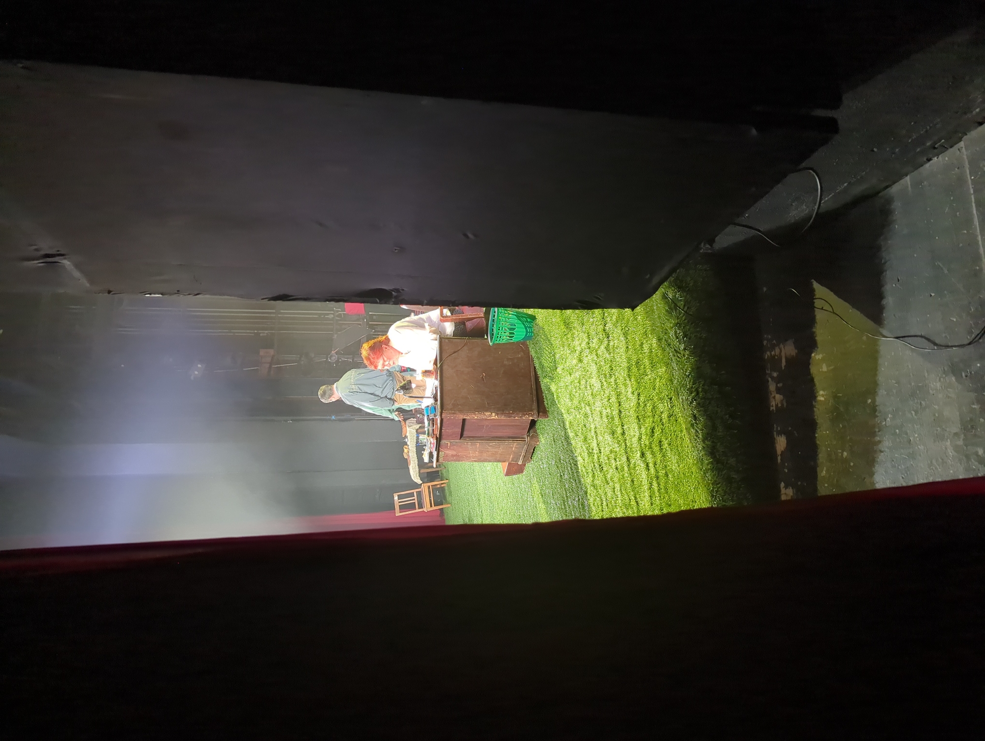 From a darkened vantage point, possibly a theater balcony, the image presents a scene on stage