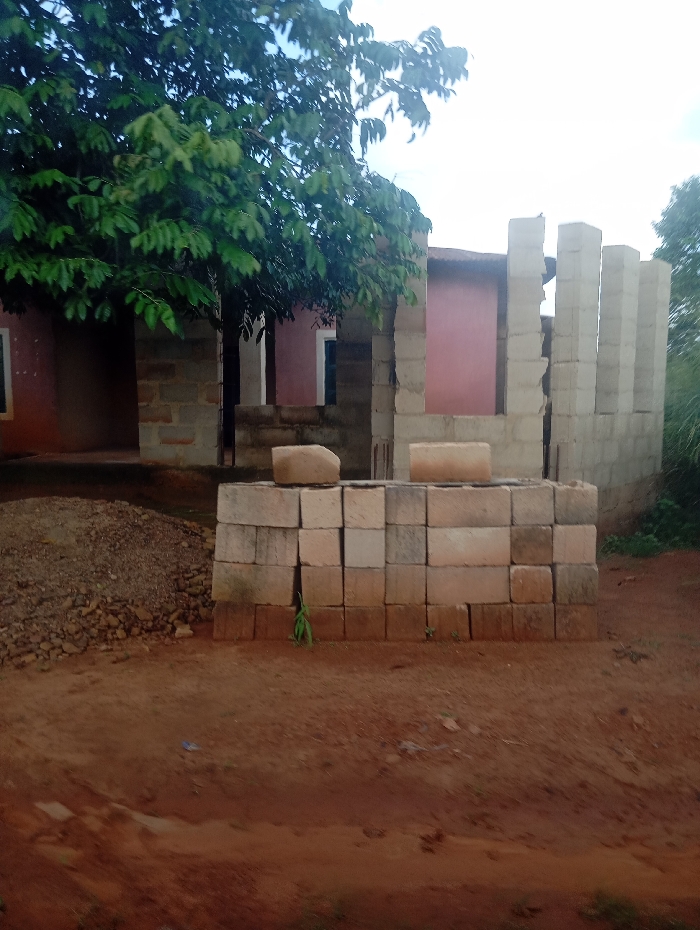 This image displays an outdoor scene in Enugu, Nigeria, featuring residential structures and construction materials under an overcast sky