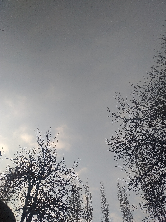 The image displays an upward-facing view of an overcast sky in the city of Unknown, Unknown. The sky occupies approximately two-thirds of the frame, showing varying shades of grey, with lighter areas in the lower-left suggesting diffused sunlight behind cloud cover. Silhouetted against the sky are numerous bare deciduous trees, indicative of a dormant season such as winter or late autumn. A large, multi-branched tree with intricate twig patterns occupies the lower-left and center, its upper branches reaching towards the middle of the frame. Another dense, branching tree is visible in the upper-right corner. Between and behind these, several tall, slender, columnar trees are visible, extending vertically upwards from the lower edge. A dark, indistinct mass, possibly a structural element or land, is partially visible in the bottom-left corner. There are no people, animals, or discernible human activities present in the scene.