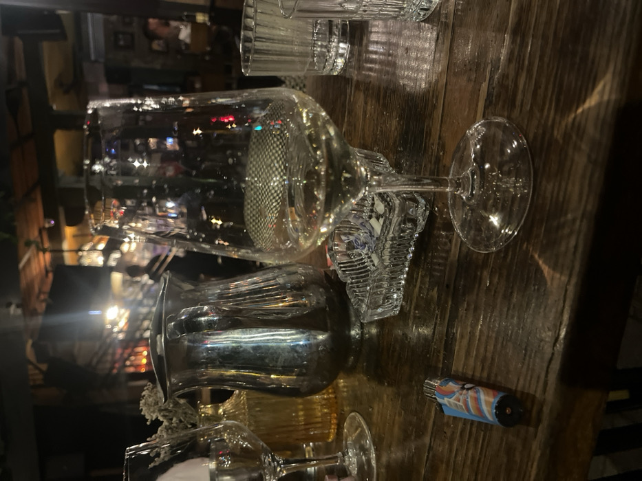 The image depicts a nighttime scene at a bar or restaurant in Tel Aviv, Israel, focused on a rustic wooden table. In the foreground, a stemmed wine glass containing a light-colored liquid, presumably white wine, stands prominently. To its left, a small blue and orange patterned lighter is positioned. Behind the lighter and the main wine glass, a clear glass ashtray holds several cigarette butts and ashes. Further left, a reflective silver pitcher, possibly containing water, is visible, flanked by another empty stemmed wine glass and a yellow decorative bottle. In the background, the scene is blurred and dark, characteristic of a low-light indoor or outdoor bar setting. Distant light sources create lens flares and reflections, and silhouettes of several individuals are discernible, suggesting a lively but ambient atmosphere. Two additional empty tumblers are visible to the right of the main wine glass.